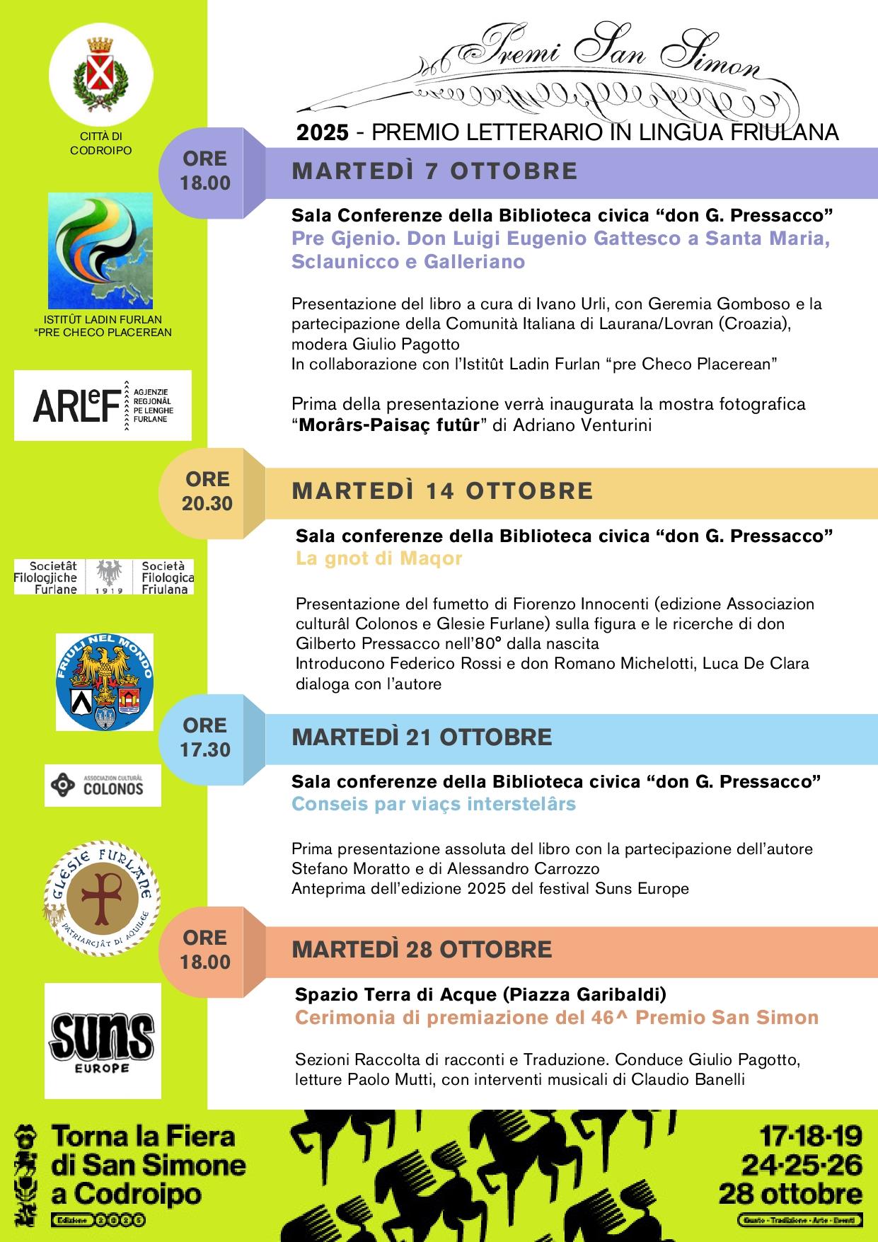 Ancje ta la edizion 2025 a son l’incuintri e la contaminazion a caraterizâ il Premi San Simon, dedicât a la memorie di Agnul di Spere (Angelo Michele Pittana), inzegnîr, poete e tradutôr furlan che al à contribuît cun impegn a la difusion da la lenghe furlane e al so confront cun altris lenghis. A saran di fat premiadis lis sezions “racuelte di contis” e “traduzion”, là che i concorints a àn “incuintrât” lis contis Villa veneta e Tornato per votare di Elio Bartolini.